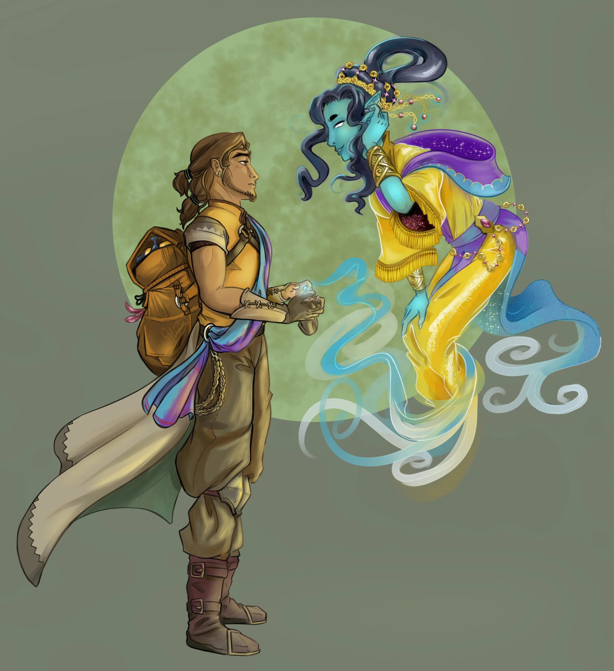 An illustration of Scanlan Shorthalt and Pike Trickfoot from the series “Critical Role.“